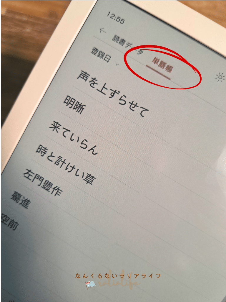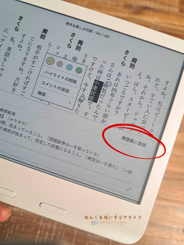 『Kobo Libra Colour』では、分からない単語や覚えておきたい言葉を、そのまま単語帳として保存できる機能があります。