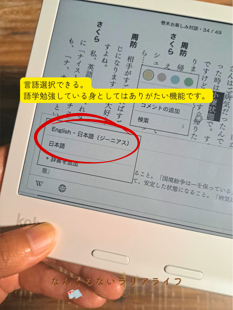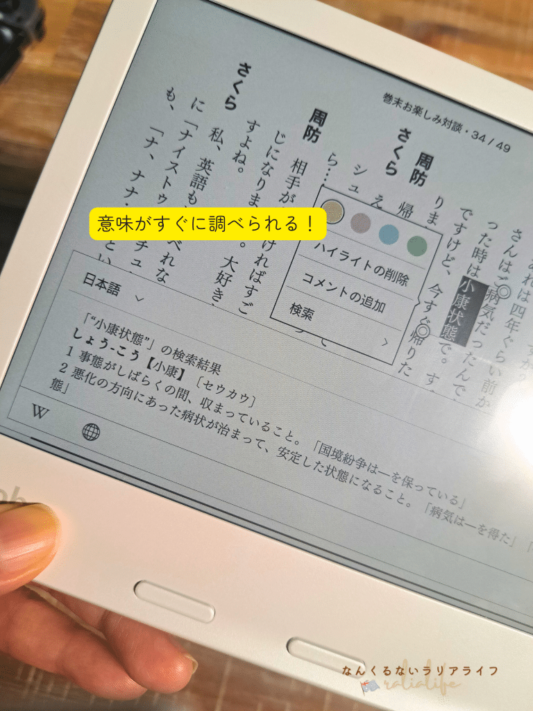 その点、『Kobo Libra Colour』では、デバイス本体で単語の意味や読み方を調べることができます。