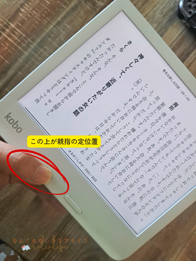 しかも、読んでいるあいだ親指は画面上に常に浮いた状態にあるか、画面に触れないよう親指を安全な場所へ移動させないといけません。